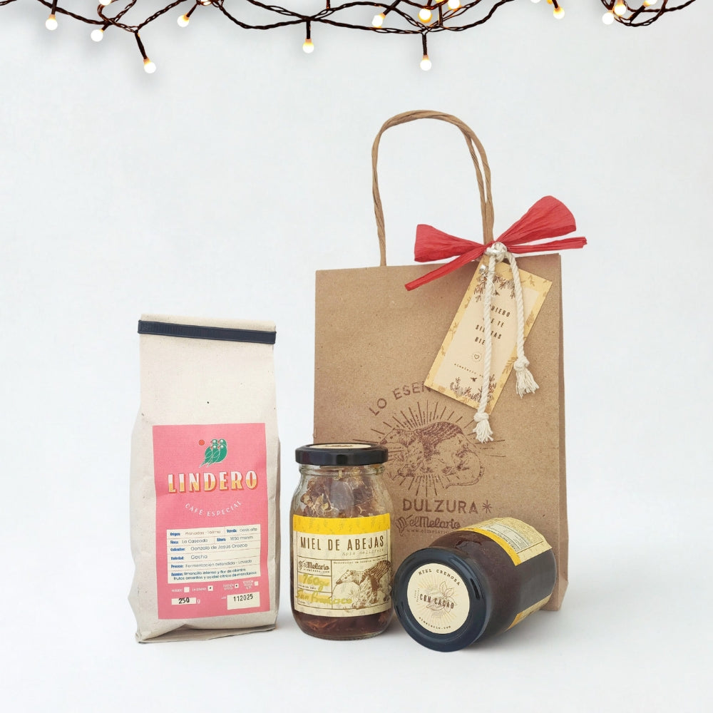 Con esta colección disfruta de tres especialidades colombianas: Café Especial, Miel en su presentación más natural y cacao cuchareable.