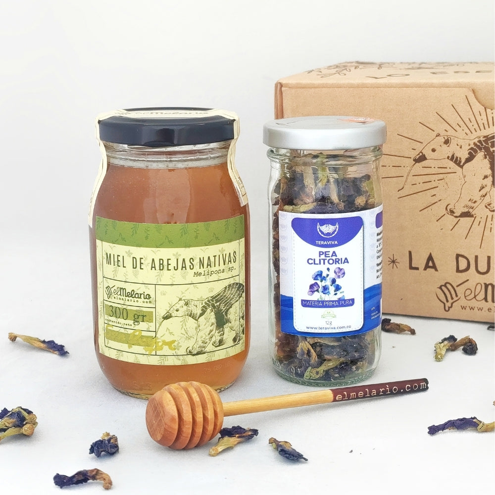 Miel de abejas Meliponas 300gr y flores de clitoria ternatea 12gr, que produce magia visual en una bebida con miel. Usa de 2 a 3 flores en infusión. (Producto de TERAVIVA, nuestros aliados en Cali) Incluye pala melaria pequeña.