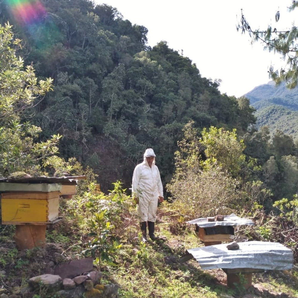 Don José Antonio Martinez nos llamó y con ese acento bonito de Nariño nos contó que empezó a ejercer la apicultura con su esposa e hijos hace 3 años en el corregimiento Sánchez, de Chachagüí - Nariño. Hoy honra la posibilidad de aprender de la vida de las abejas, de cuidar su entorno y cuidar de ellas.